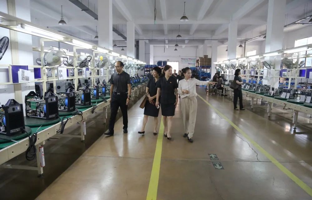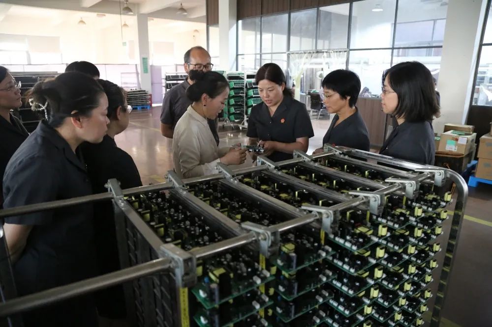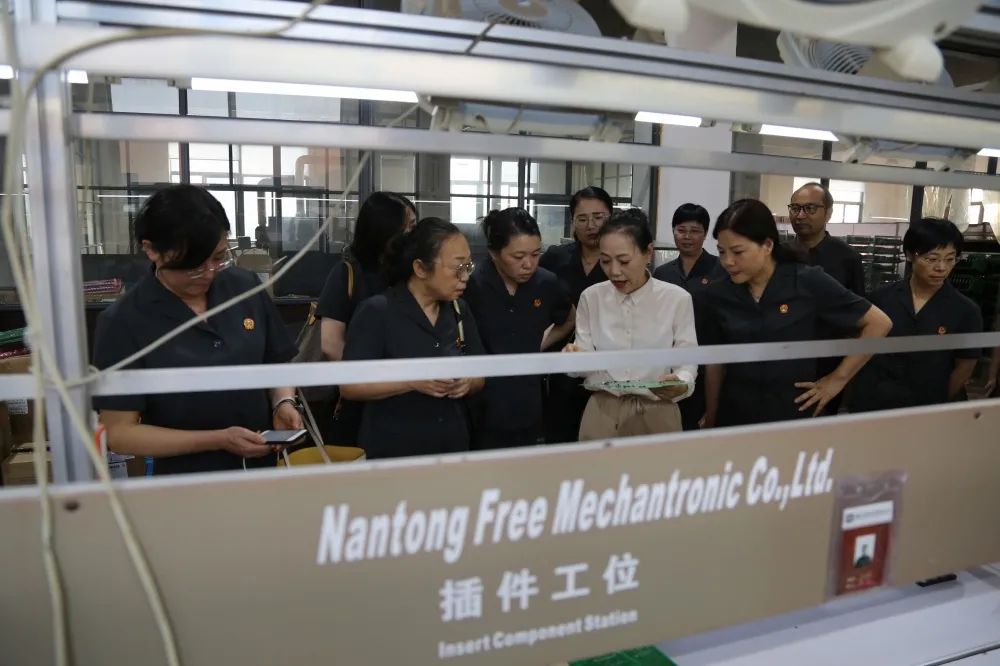 在富力机电,公司负责人吴建中与聂菁对崇川法院一行人的到来表示热烈欢迎。在二人的带领下,一行人深入工厂车间,从电子元部件的组装、检测到产品装箱,对整体的生产流程进行了实地参观与详细了解。