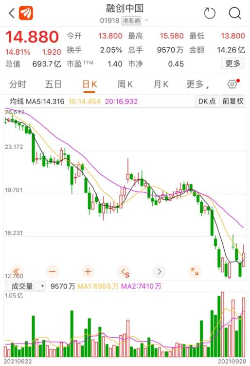 9月28日早盘,融创中国(01918,HK)盘中一度涨超20%,截至收盘,融创中国大涨14.81%,报收14.88元。