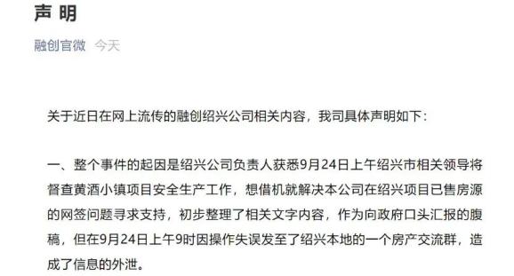 对此,融创在声明中澄清,整个事件的起因是绍兴公司负责人获悉9月24日上午绍兴市相关领导将督查黄酒小镇项目安全生产工作,想借机就解决本公司在绍兴项目已售房源的网签问题寻求支持,初步整理了相关文字内容,作为向政府口头汇报的腹稿,但在9月24日上午9时因操作失误发至了绍兴本地的一个房产交流群,造成了信息的外泄。