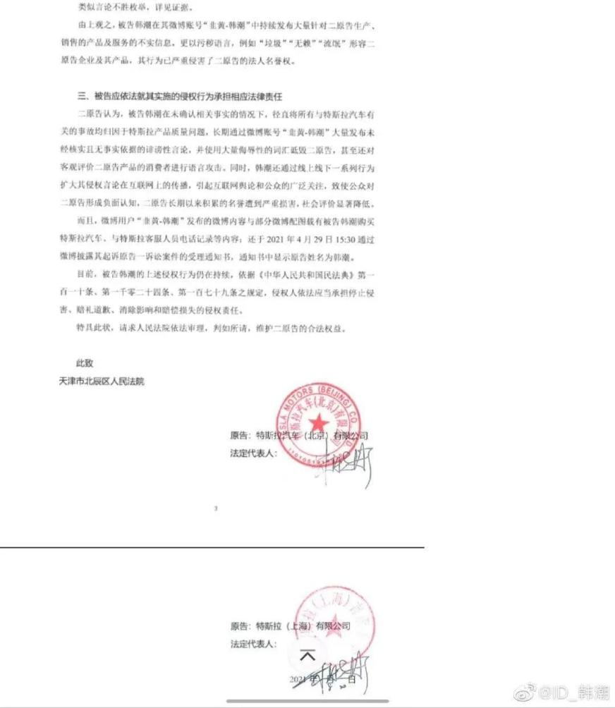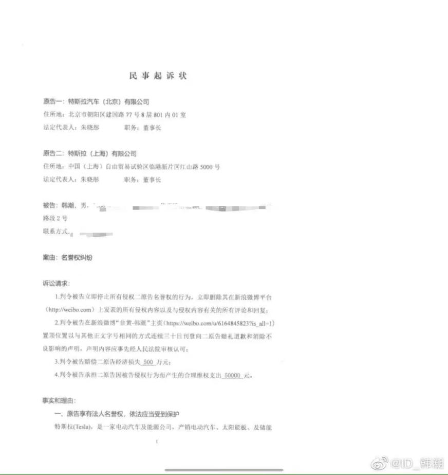 9月26日,特斯拉车主韩潮在微博上表示,他收到了特斯拉的名誉权纠纷起诉状,被特斯拉索赔经济损失500万元及承担维权支出5万元。据了解,法院已对此次诉讼正式立案,并将在 10 月 28 日开庭。特斯拉方面在诉讼书中称,车主韩潮从 2020 年初开始通过新浪微博个人账号长期发表诋毁、贬低特斯拉的相关言论,其行为已经严重侵害了特斯拉公司的法人名誉权。
