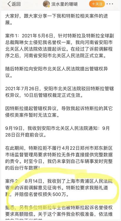 案件二是,8月14日,张女士收到了上海市青浦区人民法院寄来的诉前调解意见征询书。特斯拉要求张女士赔礼道歉,并赔偿名誉权损失500万。据悉,另有多位特斯拉车主也被特斯拉起诉名誉侵权要求高额赔偿。