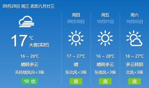 天气趋势:9月29日:全省晴天间多云;9月30日:陕北多云间晴天,关中、陕南晴天间多云;10月1日:陕北多云间阴天,延安南部有阵雨;关中、陕南晴天间多云。