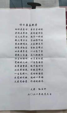 诗中写道:“相识在东方/牵手半世纪/共同去革命/共同建设家/……一生为别人/遗体献国家/不觉时间快/逝世一年了/夫君思念甚/作诗把你夸。”