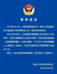 ▲28日,绥化市公安局北林分局发通报称,26日20时许,王某酒后回北林区翡翠城小区住所出入口扫码时,与执行疫情防控人员发生冲突,后持刀欲实施报复。目前,王某已被依法刑事拘留,案件在进一步审理中。