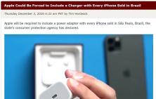 ▲据外媒报道,巴西消费者权益保护机构将对苹果发出处罚通知,因其销售的iPhone13不带充电器。该机构负责人表示,将手机和充电器分开卖是不合法的。此前该机构曾因iPhone12不送充电头罚款苹果200万美元。