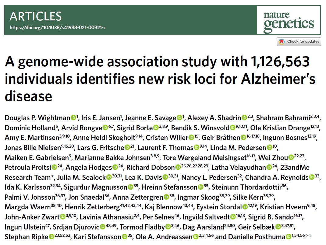 2021年9月7日,阿姆斯特丹自由大学的研究团队在 Nature Genetics 期刊上发表了题为:A genome-wide association study with 1,126,563 individuals identifies new risk loci for Alzheimer's disease 的研究论文。