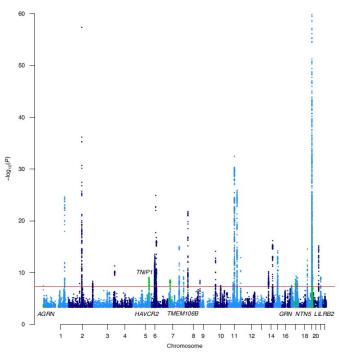 他们发现了38个独立位点中的3915个变异。在这38个位点中,有7个未曾被GWAS报道过,其中5个未曾报道过与痴呆症相关(AGRN、TNIP1、HAVCR2、NTN5、LILRB2)。