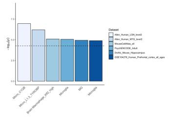 MAGMA组织特异性分析确定了脾脏作为唯一的GTEx组织,而单细胞 RNA 测序数据提示风险基因可能在小胶质细胞中表达。因此,小胶质细胞和免疫组织是识别风险相关基因对阿尔兹海默病发病机制贡献的潜在实验模型。