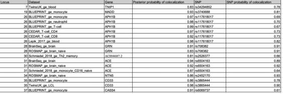 正如预期的那样,本研究中确定的基因组风险位点富集与基因功能相关的活性染色质和变异注释。随后研究团队进行了功能注释。根据来自大脑和免疫组织/细胞的位置和表达数量性状基因座(eQTL)信息,他们将变体功能定位到基因,确定了989个基因,这些基因定位到38个基因组风险基因座中。