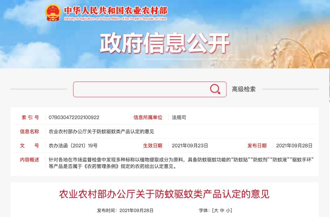 原标题:《“防蚊贴”是农药吗?农业农村部提出认定意见》