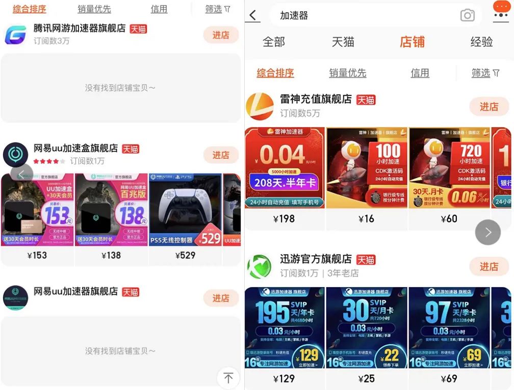 9月28日起,微博和部分社交论坛已经出现腾讯、网易天猫加速器旗舰店下架了所有产品的讨论。经人民电竞查证,目前腾讯、网易的天猫店铺确已无任何产品在售,网易加速器的京东旗舰店也下架了相关产品,不过主机端的加速盒仍然正常销售。同为加速器的迅游、雷神等品牌仍然在正常售卖。