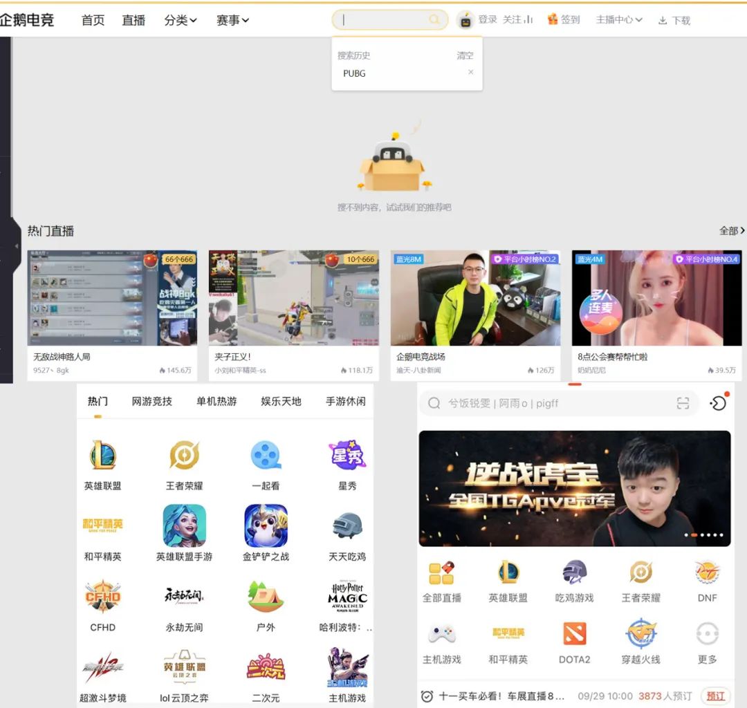 目前,企鹅电竞已经下架了和PUBG相关的所有内容,目前搜索PUBG相关的内容都无法显示。虽然斗鱼、虎牙还有绝地求生的赛事和直播内容,但斗鱼的绝地求生板块已经更名为“吃鸡游戏”,虎牙更名“天天吃鸡”。