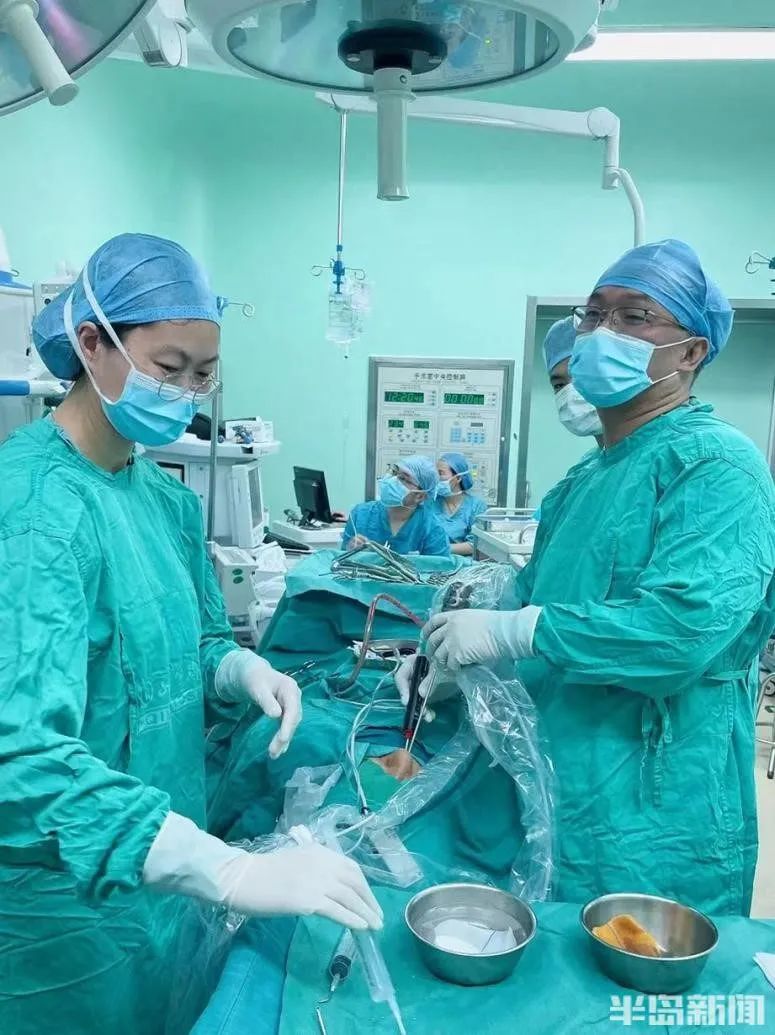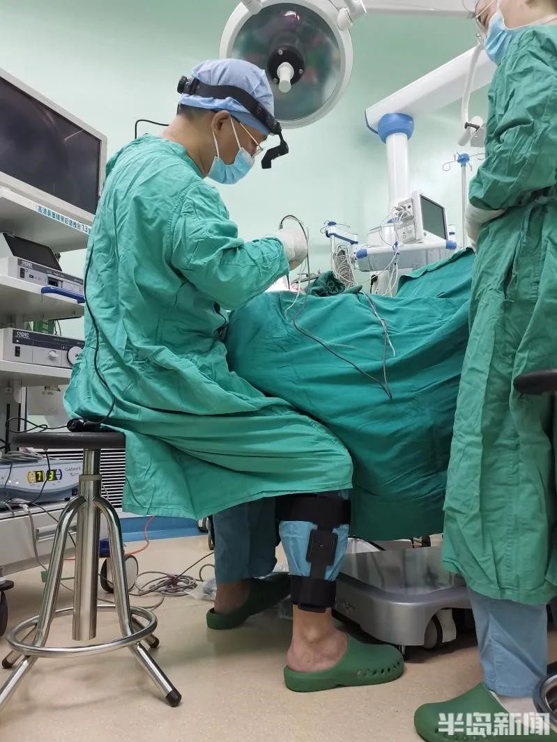 手术过程中,袁英腿部难以支撑,最终坐着给病号完成手术。