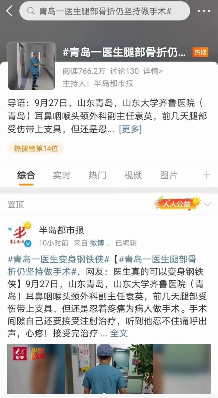 半岛都市报微博原创话题“青岛一医生腿部骨折仍坚持做手术”一度冲到微博热搜总榜第14位, 感动了全国网友。截止到现在,话题全网阅读量超5000万,网友留言上千条。
