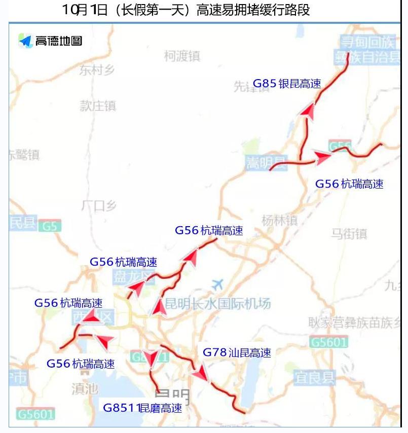 预计9月30日,在晚高峰时段,也就是下午5点左右开始将出现高峰车流、出昆车流与学生放学车流“三流”叠加的情况,城区主要道路、二环快速关键节点以及进出昆高速公路将出现明显的交通拥堵。