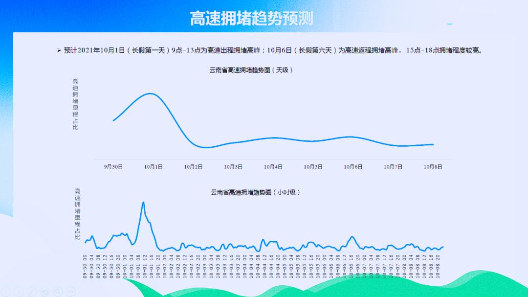 预计10月1日(长假第一天)9时-13时为高速出程拥堵高峰;10月6日(长假第六天)为高速返程拥堵高峰,15时-18时拥堵程度较高。