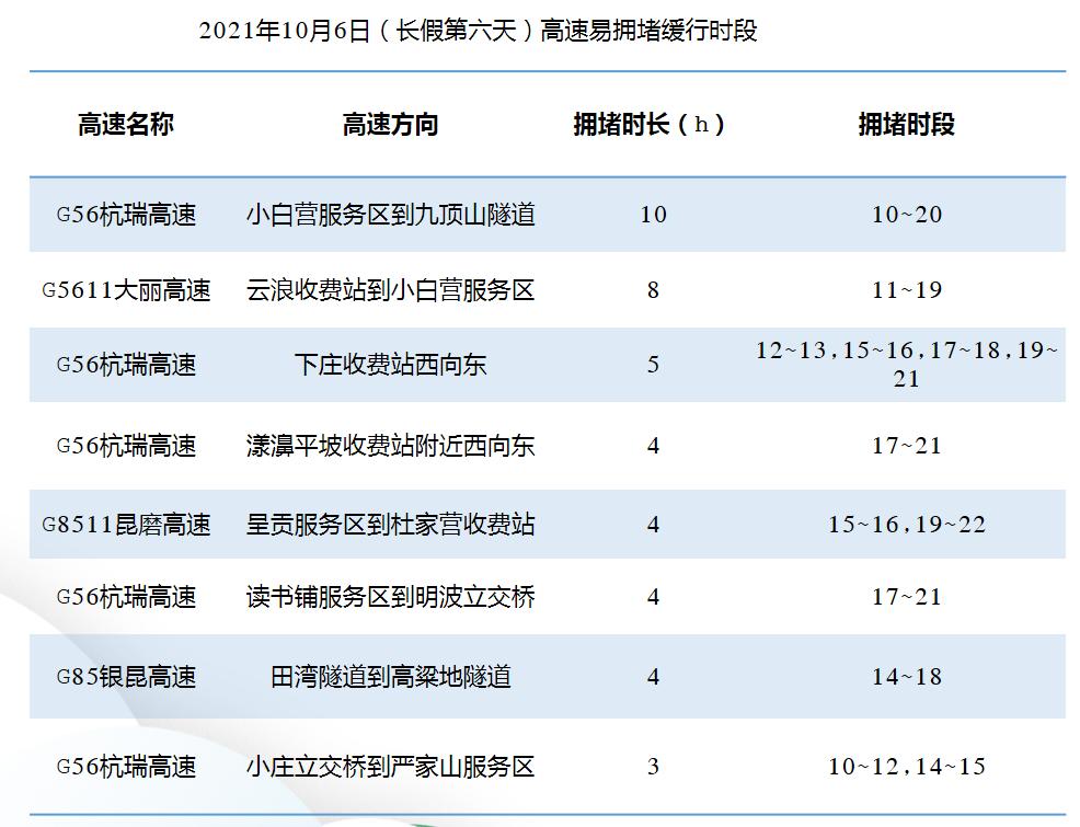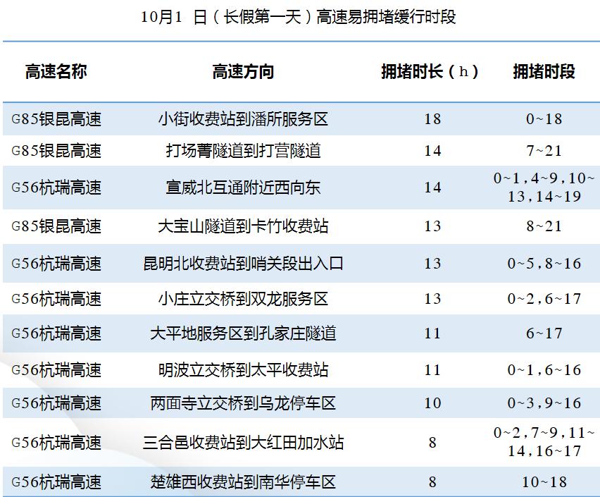同时,在每日的10—11时、13—14时、16—17时、20—21时四个时段,各条高速公路将会出现短时车流高峰。