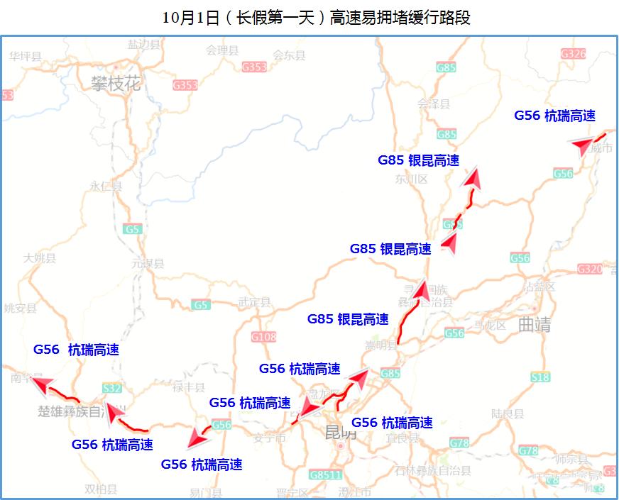 今年国庆节期间进出昆车流量将有小幅上升,并在9月30日(节前一天)晚高峰和10月1日(长假首日)10时至13时迎来出城车流高峰,10月6日、7日下午14时起面临返城车流高峰。