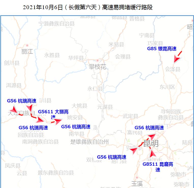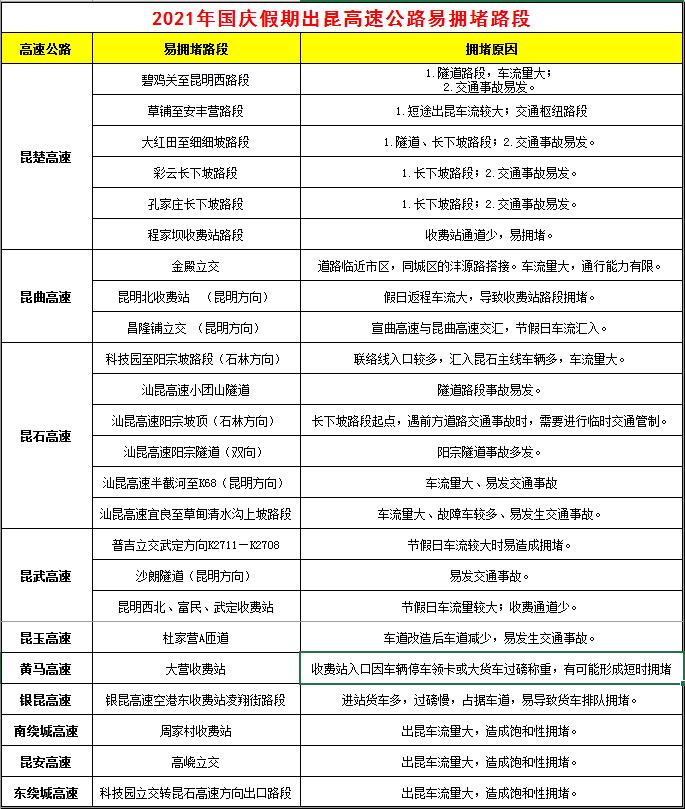 那么,今年国庆节期间昆明市易拥堵路段会出现在哪些地方呢?结合往年情况,2021年国庆节假期我市高速公路、重点景区、商圈周边道路等易拥堵区域交通运行情况研判如下: