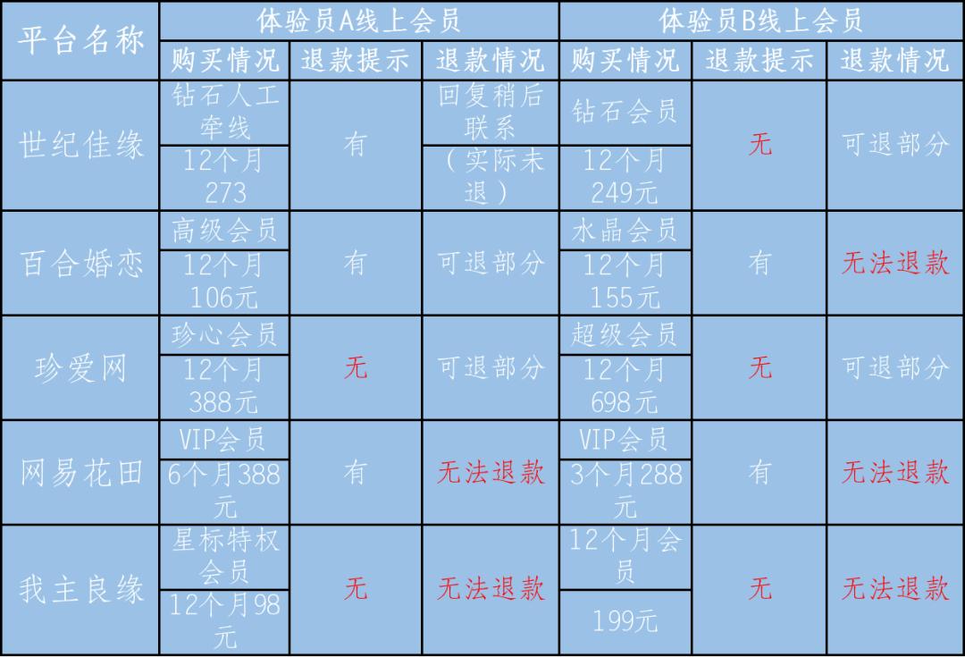 在售后退款方面,世纪佳缘、珍爱网、我主良缘三家服务协议均有一方非法定原因解除合同,可扣除部分金额后退款约定,但执行中世纪佳缘B店无视合同约定拒绝退款;世纪佳缘A店虽然最终完成退款,但耗时三个月;珍爱网退款相对顺利,平均用时约半个月;我主良缘退款用时约2个月。总的来说,从申请退款到能退款成功,平均用时超过一个月,平台存在拖延情况。