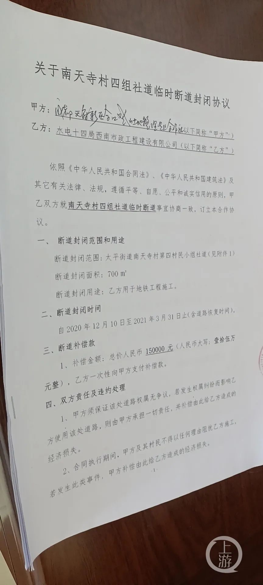 施工方水电十四局与南天寺村四组签订的断道施工协议。/受访者供图