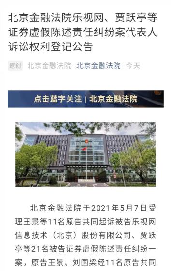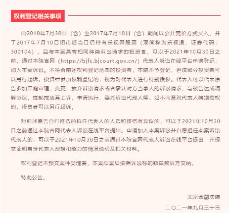 9月30日,北京金融法院发出公告,已确定乐视网、贾跃亭等证券虚假陈述案诉讼权利人范围,启动参与诉讼投资者的登记。