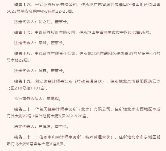 不过,此次案件值得注意的是,平安证券、中泰证券、中德证券、利安达会计师事务所(特殊普通合伙)、华普天健会计师事务所(北京)有限公司、信永中和会计师事务所(特殊普通合伙)六家中介机构被列为共同被告,这就让胜诉后获得执行的概率大大增加。