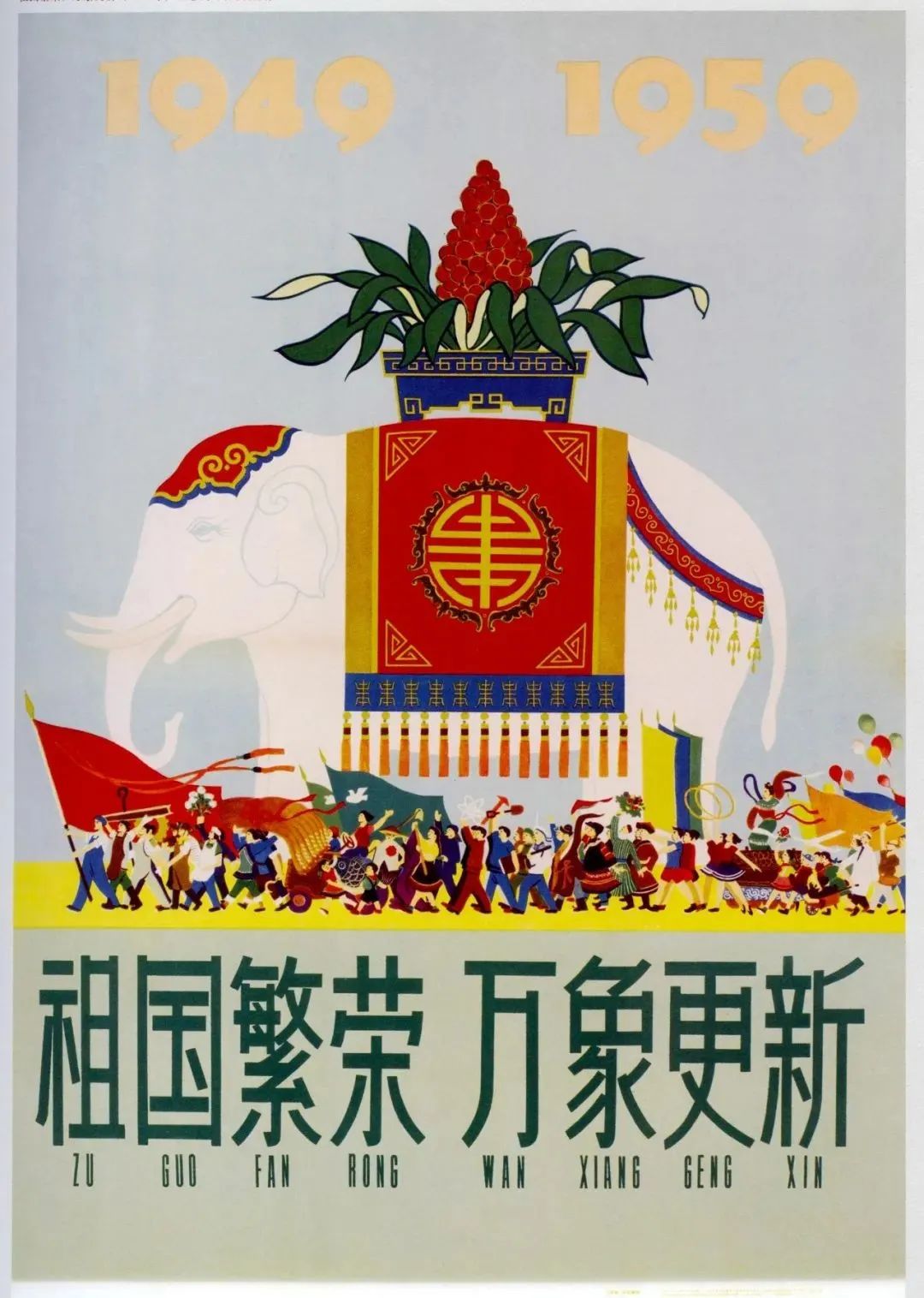 为庆祝新中国成立十周年而作。画面主体是一头驮着万年青、象征祥瑞的白象,下方是各族各行业人民欢呼前进的队伍,虽然作品采用了整洁的、近乎冷静的平面装饰手法,但却洋溢着饱满热烈的节日氛围。