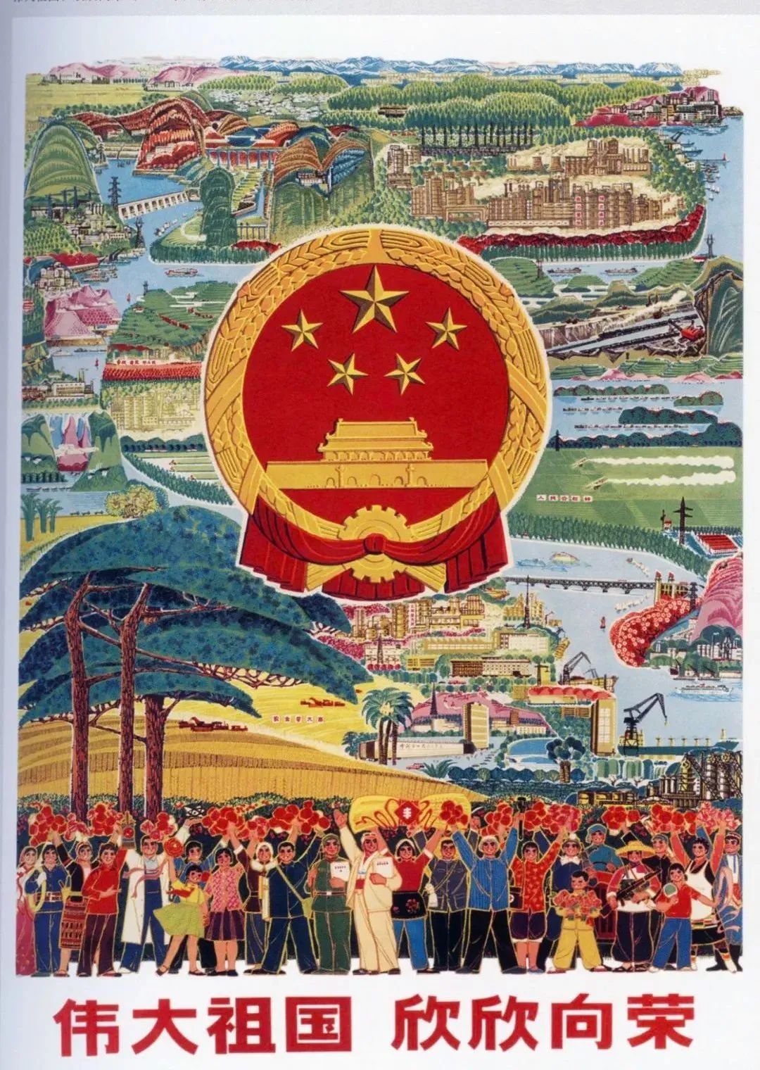 以引人入胜的细腻笔法,描述了祖国的美丽河山以及经济建设蒸蒸日上的图景,如同一般流行的做法,画家在国徽下添加了一排人物,照例是各行各业各族人民群众。