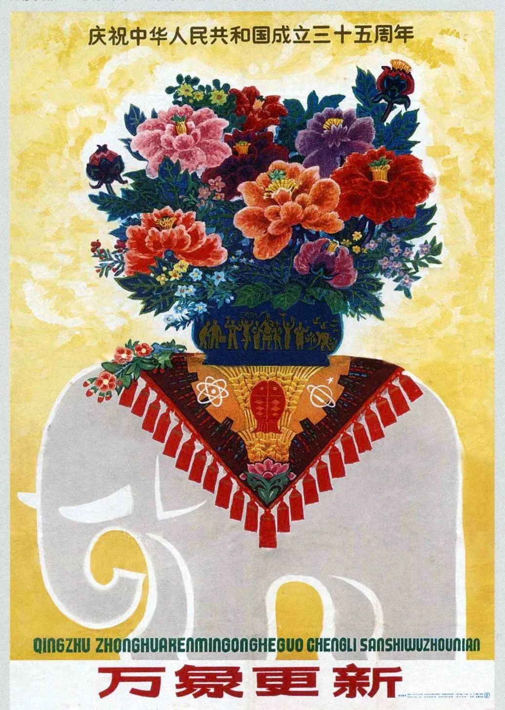 主标题是一个耳熟能详的成语,借用谐音,画面表现了一头批着锦缎驮着百花的白象,象征国家祥瑞花瓶上绘制着各行各业的劳动者,锦缎上绣有双鱼、麦穗等传统吉祥图案,对比上面1959年创作的同题材作品,这幅作品增加了科学的元素,与当时“实现四个现代化”的口号呼应。