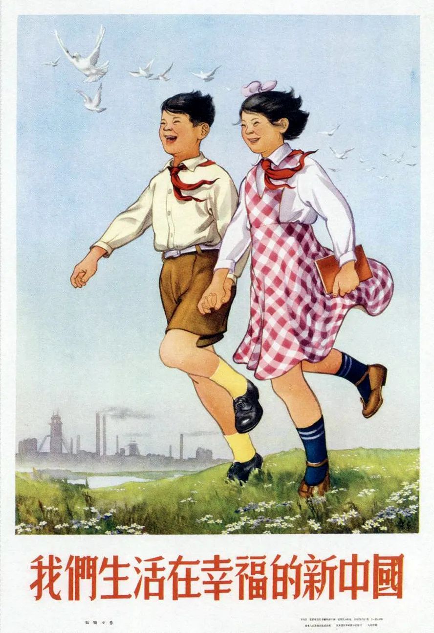描绘了两个少先队员牵手走在田野上,头上白鸽飞舞,脚下青草葱葱,远处欣欣向荣的工厂厂房,作品带有漫画的笔意和基调。