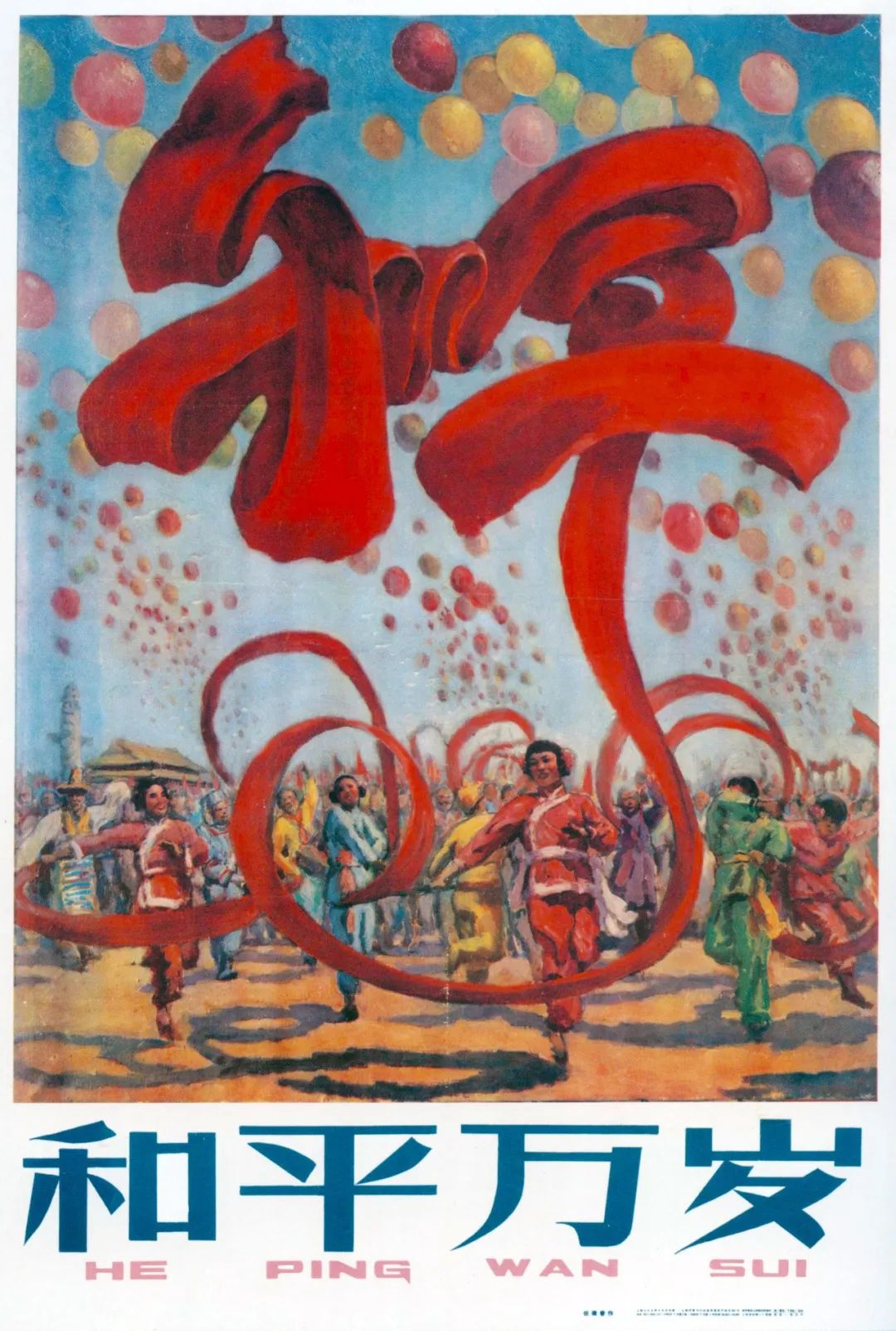 画家描绘了天安门秧歌舞等具有民族化意味的场景事物,热烈的秧歌欢快起舞,大红绸带当空飘展,幻化为和平二字,富有那个时期的亢奋与热烈。