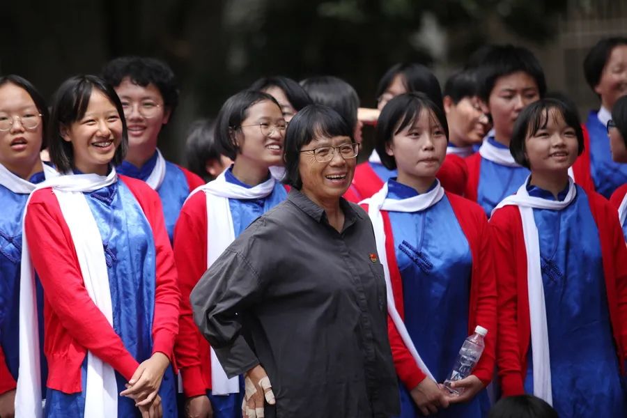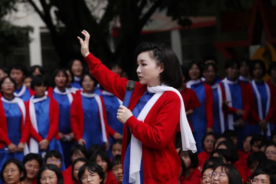 操场上,两代江姐和全校师生高歌《红梅赞》