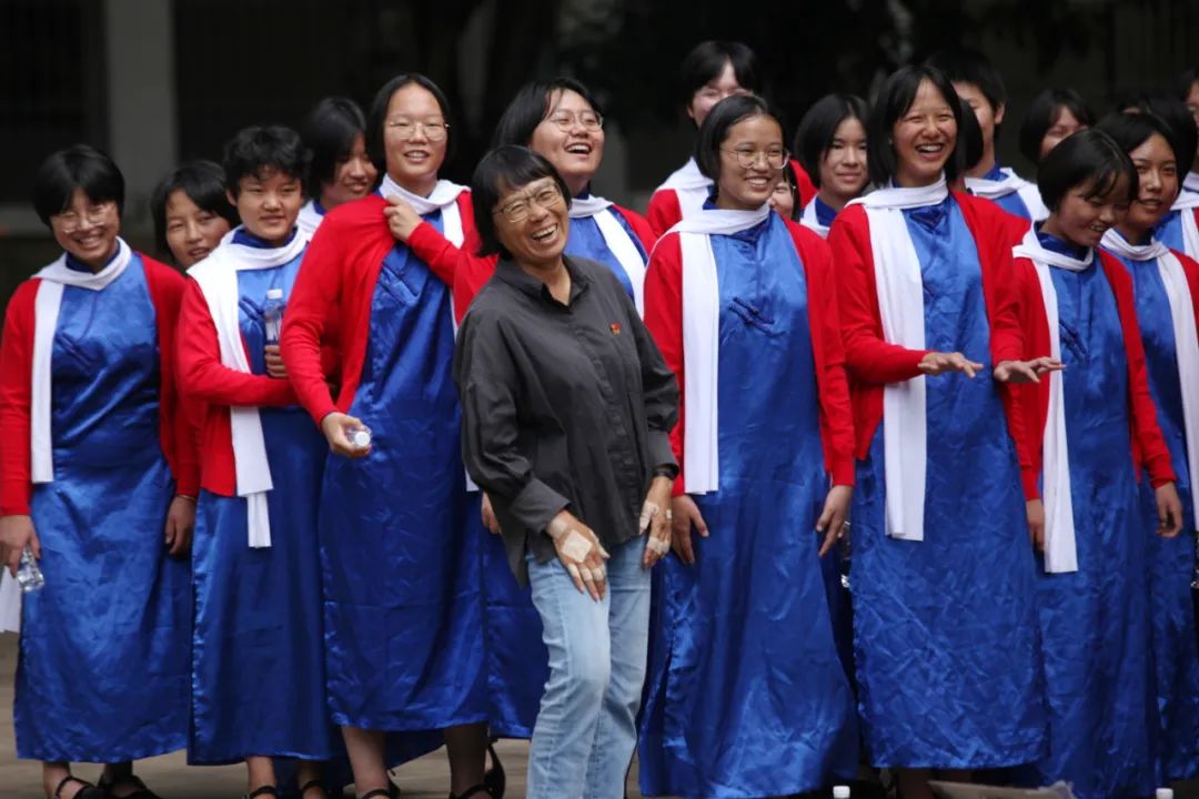 难得见到几位北京来的艺术家,张桂梅老师把全校的孩子们都集合在教学楼前。记者发现连女孩子们的课间操都是根据《红梅赞》编排的舞蹈,整齐的队伍里,二三十位“小江姐”格外显眼,她们一水儿的蓝长裙、红毛衣和白围巾,这是歌剧《江姐》舞台上的标配。在学校宽阔的操场上,明媚的阳光下,孩子们张张笑脸兴奋地等待着“江姐”传承人们带来的精彩表演。