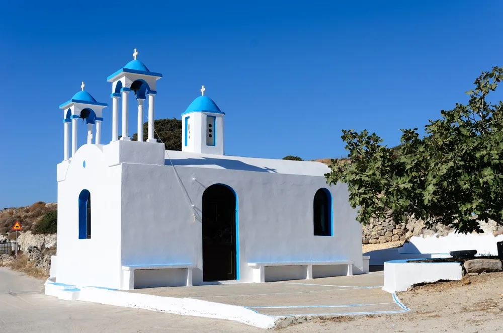 蔚蓝开阔的海景,庄严的蓝顶教堂,梦幻的白色拱门,地中海风情的屋瓦门窗。