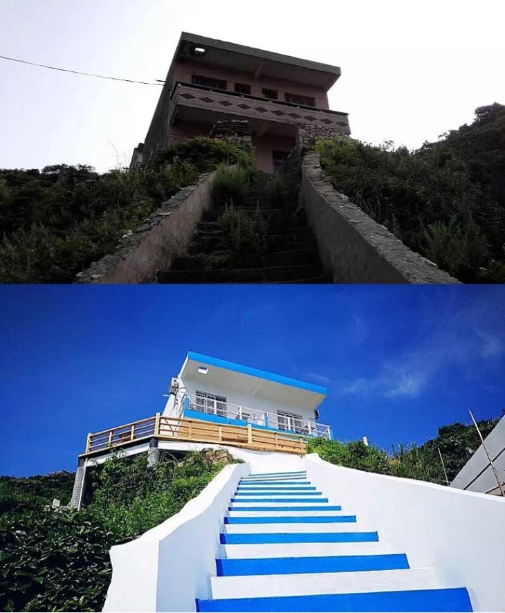 2015年,潘龙新和朋友鲨鱼、小林第一次来到花鸟岛时,这里还是一个几乎未经开发的小渔村,岛上只有几家岛民开的家庭式旅馆。他们很快被这片原始、安静的风光所吸引,合伙盘下了离码头不远处半山腰上一栋荒废的民房,一步步改造为如今的小民一宿,这也是岛上最早一批蓝白风格的民宿。