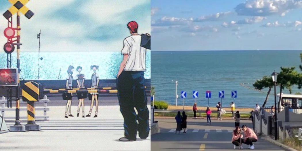 山东威海火炬八街就因为被发现神似《灌篮高手》的取景地镰仓高校前站而迅速走红。正对大海的丁字路口,坡路尽头的栏杆、红绿灯和斑马线,确实让人一秒穿越到动画中樱木花道与赤木晴子的唯美一幕。