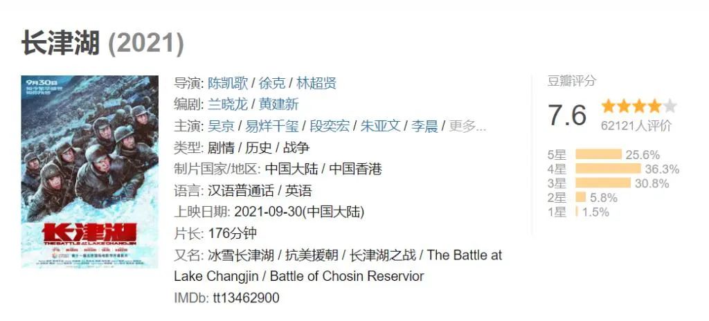 而在最新的豆瓣电影评分中,长津湖收获了7.6的高分。