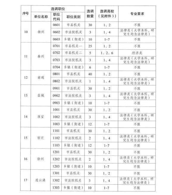 4﹒综合考察。根据素质测试成绩,按照各职位选调数量1∶1.5的比例,从高分到低分确定考察人选,达不到1∶1.5比例的相应调减选调数量(男女选调数量同步调减)。市县机关职位每校考察人选一般不超过45人(报考盐城、淮安、宿迁市不受每校考察人数限制),法院系统职位每校考察人选一般不超过15人。考察人选在学校就业信息网公示。江苏省委组织部组建考察组,对考察人选进行综合考察。