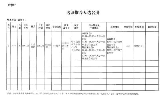1﹒推荐报名。报考人员填写《选调推荐人选名册》,向所在院系党组织提出申请,高校党委组织部(学生处、就业指导中心)审核汇总,并报高校党委研究确定推荐名单。高校推荐不设名额限制。推荐名单须在学校就业信息网公示。具体职位及选调数量见附件。