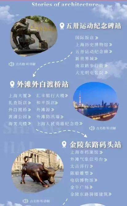 车辆沿着西藏中路、九江路,15分钟后缓缓停靠外滩外白渡桥站。此时,一名专职导游已等候在站台,等待乘客下车,将带领游客一起“阅读”外滩经典城市地标。