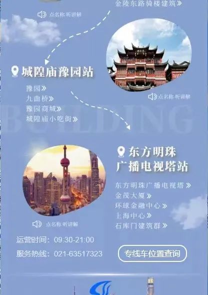 建筑可阅读专线车首班车为9:30,末班车为21:00,45-55分钟/班,站点人工讲解服务时间为9:30-16:00,下午16:00以后可免费换乘都市观光1线、2线、3线,真正实现了实现“一张车票,一票畅游、多点上下”。