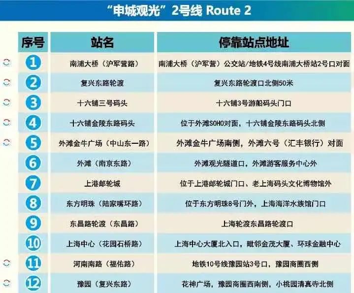 蓝线:外滩A(三阳食品)-外滩B(上海总工会)-东方明珠(2号门)-环球金融中心和金茂大厦-老码头-十六铺(浦江游览码头)