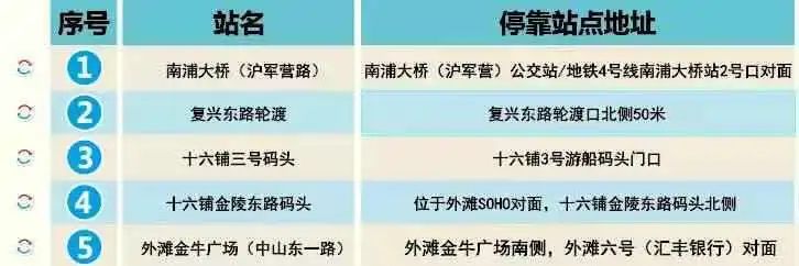 一共有7个换乘站:河南南路福佑路、豫园(复兴东路)、十六铺三号码头、十六铺金陵东路码头、外滩金牛广场(中山东一路)、南浦大桥(沪军营站)、复兴东路轮渡