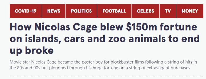 受疫情防控要求,选择留守的基金君在刷新闻中,无意中刷到美国影视巨星尼古拉斯凯奇破产的消息,心中唏嘘不已。