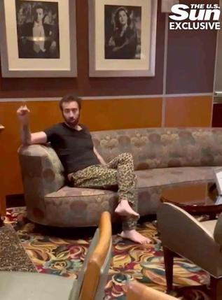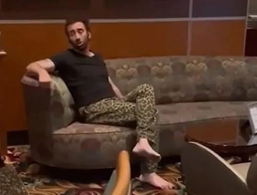 视频中,尼古拉斯·凯奇穿着豹纹裤子、黑色T恤,整个人看起来比电影上消瘦了不少。他懒散地坐在沙发上,光着脚,鞋子被丢在远处。