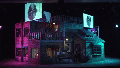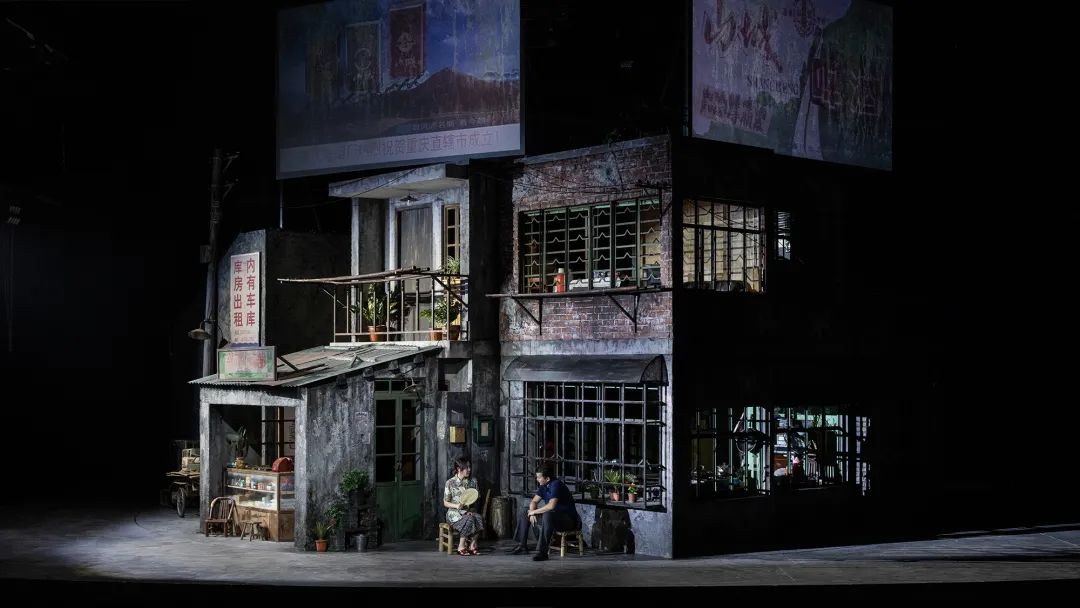 闪烁的霓虹灯、复古的小卖部、破旧狭窄的小巷,都把观众拉回了二十年前。三层楼的布景借助大转台旋转呈现,三楼天台竖立的三块广告牌会在剧情需要时变化为影像大屏。房屋内的精心设计和演员细腻到位的演绎,都在大屏幕上一览无遗。