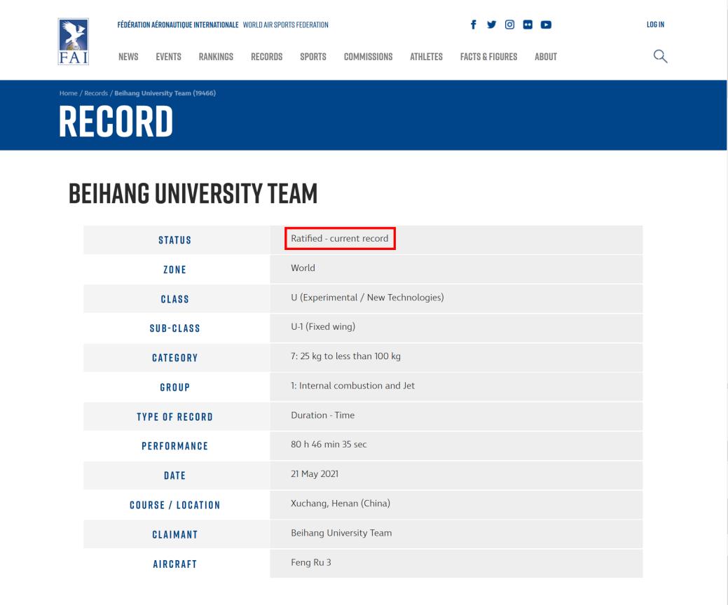 由北航“冯如三号”团队研发的“冯如三号-100型”无人机持续飞行了80小时46分35秒,再次刷新了由自己保持的该重量级的世界纪录,又成功超过了由美国极光飞行科学公司研发的“猎户座”2500-10000kg级油动固定翼无人机2014年创造的80小时2分52秒的世界纪录,跃居全世界油动固定翼无人机(重量等级无差别)续航时间的榜首。