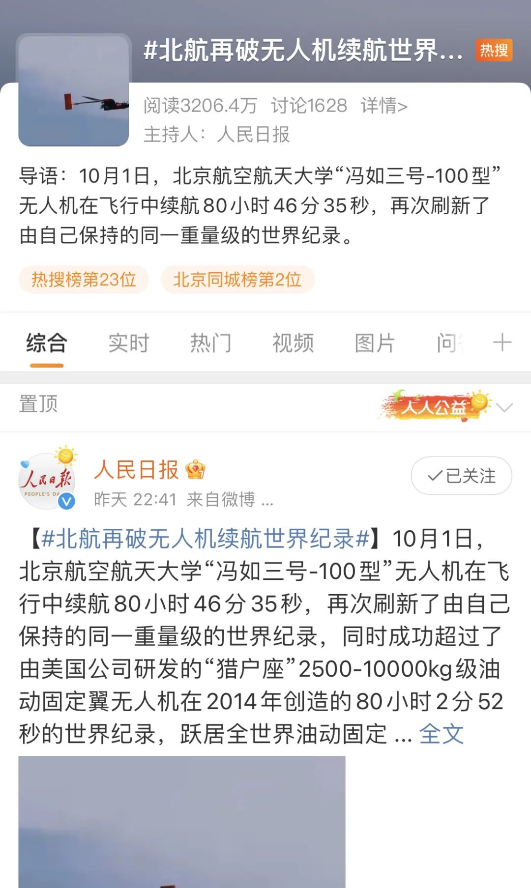 10月1日,国际航空联合会(FAI)正式认证了北京航空航天大学“冯如三号”团队创造的25-100kg级油动固定翼无人机续航时间新的世界纪录。