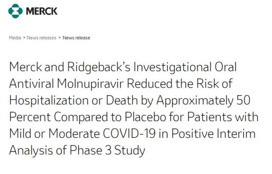 这种名为Molnupiravir的药物是口服的,两家公司表示,在该药物的临床试验结果显示令人信服的结果后,将尽快寻求在美国使用该药物的紧急授权。